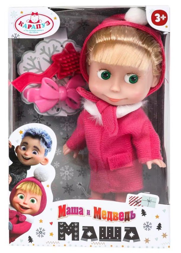 Маша одета в розовое пальто с меховым воротником и зимнюю косынку с помпоном, в точности как героиня популярного мультфильма. Одежда легко снимается и надевается. У куклы милое, детально проработанное лицо и длинные волосы, за которыми можно ухаживать с помощью аксессуаров из набора. С весёлой и любознательной Машей девочке будет интересно и весело играть, с ней можно пойти на прогулку или отправиться в путешествие.